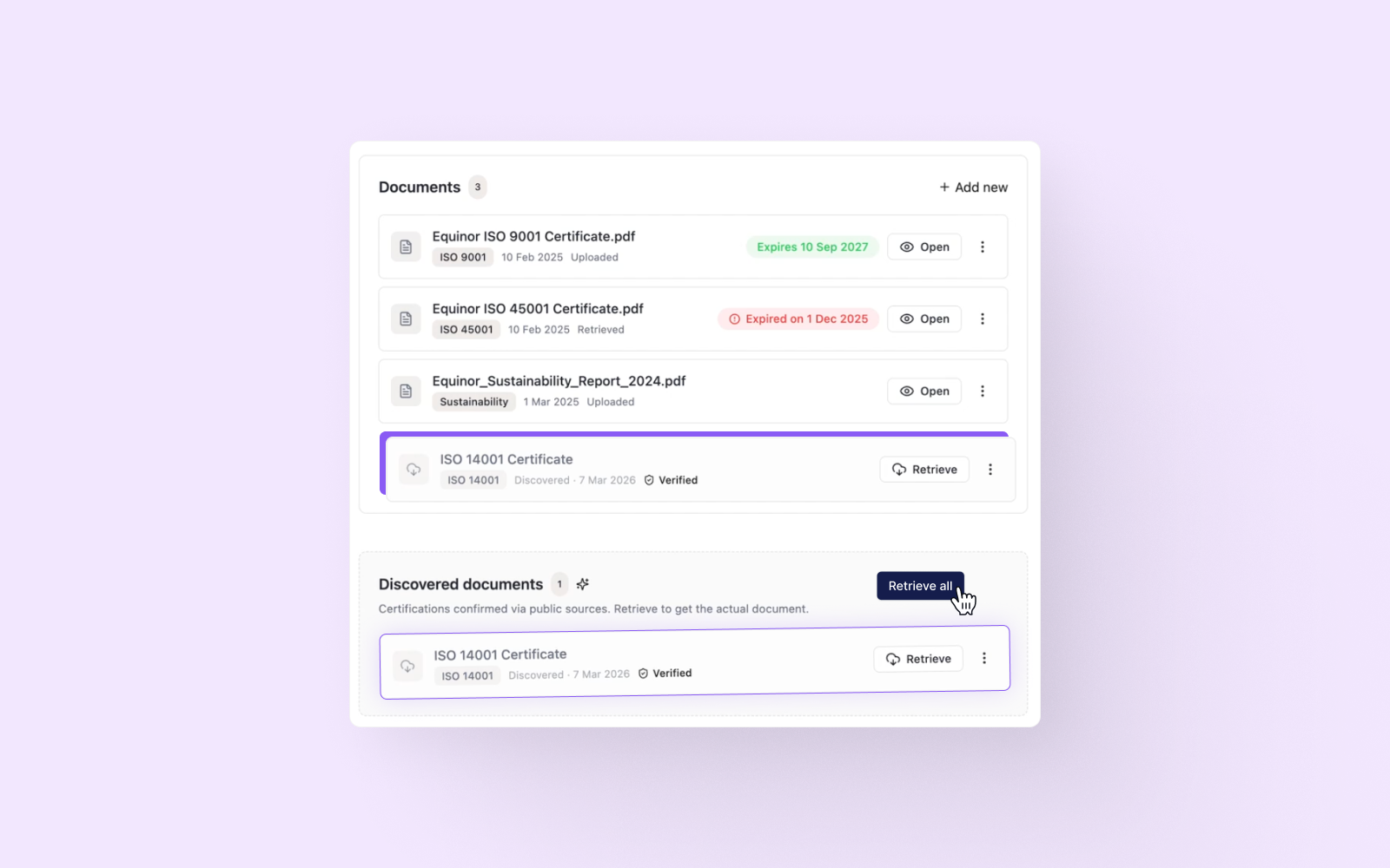 The Compliance Document Agent finds and pulls publicly available documents automatically, before anyone has to go looking.