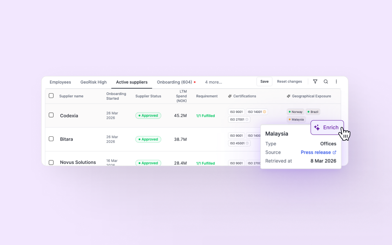 The Geographical Exposure Agent reads ESG reports, annual statements, Transparency Act filings, and more automatically and pulls out production countries with the associated risk signals, so the picture is there when you need it.