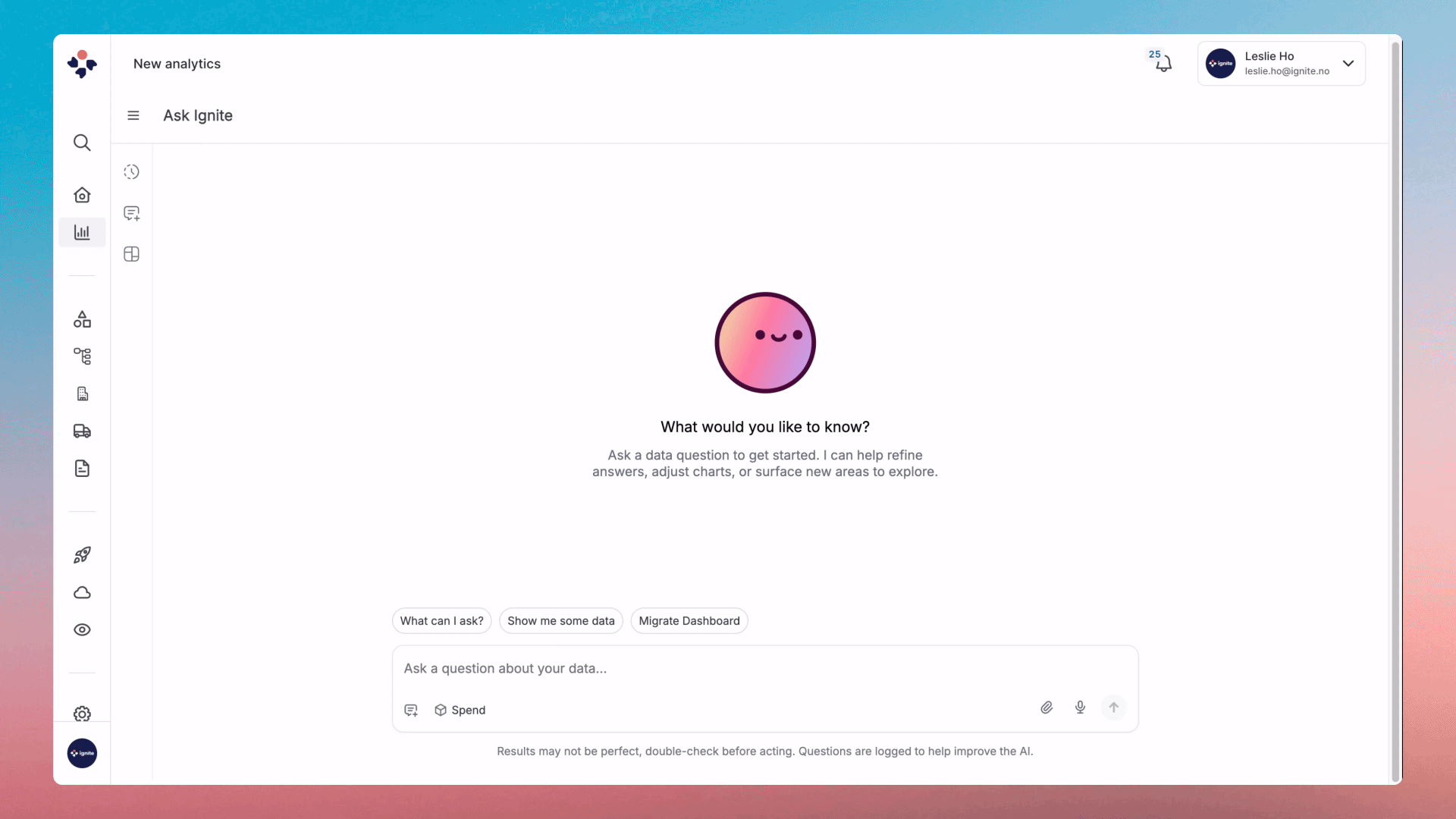 Ask Ignite Ignite comes with out-of-the-box dashboards that give you an immediate view of spend and suppliers the moment you're up and running. But procurement teams always have questions that go beyond the standard view (60% of custom analyses in Ignite never get saved).