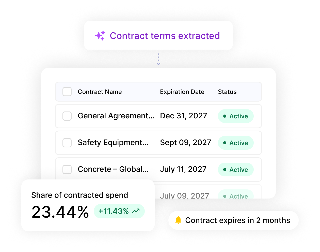 See contract terms alongside spend and supplier performance, so renegotiations are faster, better prepared, and grounded in data.
